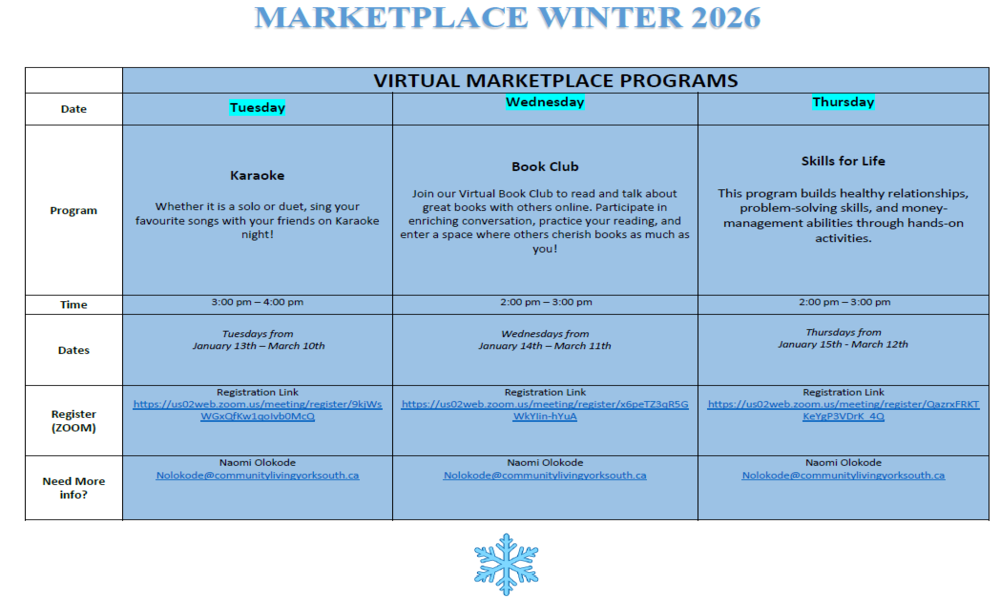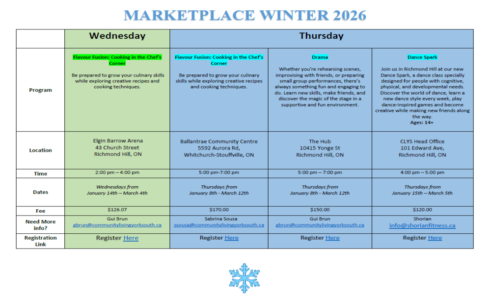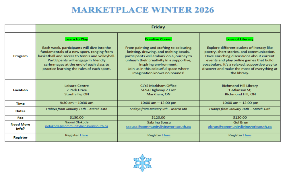 The Community Living York South Marketplace program provides a full range of educational, recreational and social programs. These courses range from 8-10 week long programs and teach skills geared towards independence such as cooking, creating friendships, and building personal budgets. Other programs focus on building social connections and skills such as Thrive, Connect and Explore, and Drama! We also have programs that focus on physical activity such as YMCA and Nature Explorers. Through these courses, Community Living York South is committed to providing quality programs that promote personal growth, social skills and physical fitness at a reasonable cost.