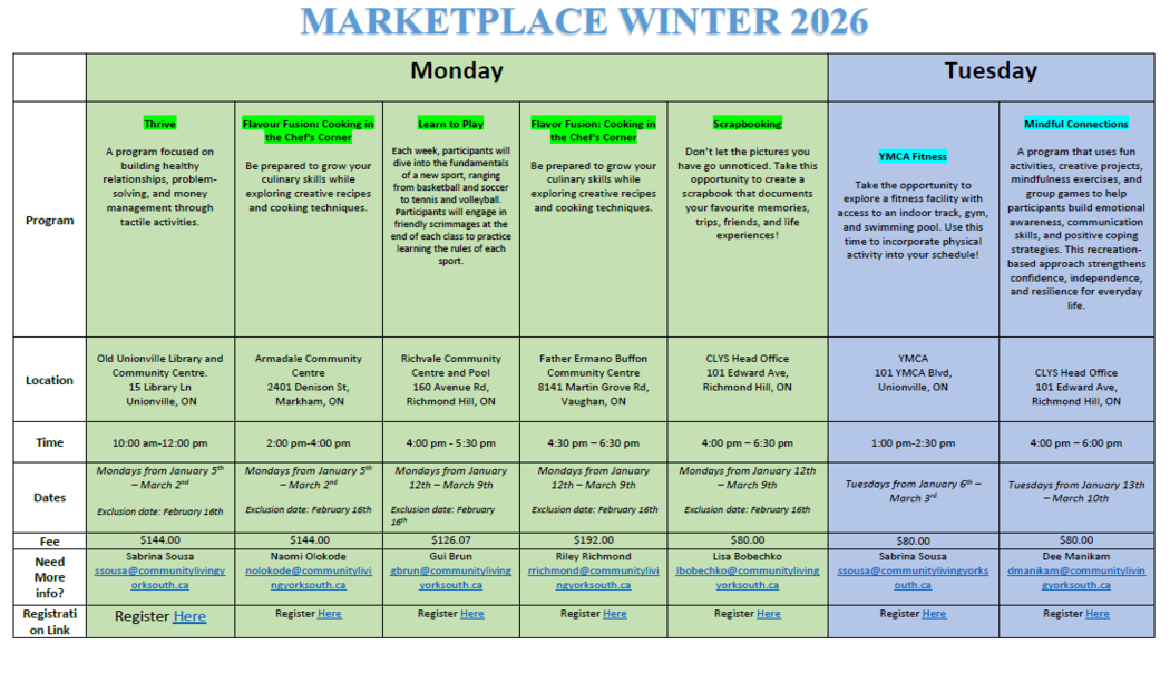 The Community Living York South Marketplace program provides a full range of educational, recreational and social programs. These courses range from 8-10 week long programs and teach skills geared towards independence such as cooking, creating friendships, and building personal budgets. Other programs focus on building social connections and skills such as Thrive, Connect and Explore, and Drama! We also have programs that focus on physical activity such as YMCA and Nature Explorers. Through these courses, Community Living York South is committed to providing quality programs that promote personal growth, social skills and physical fitness at a reasonable cost.